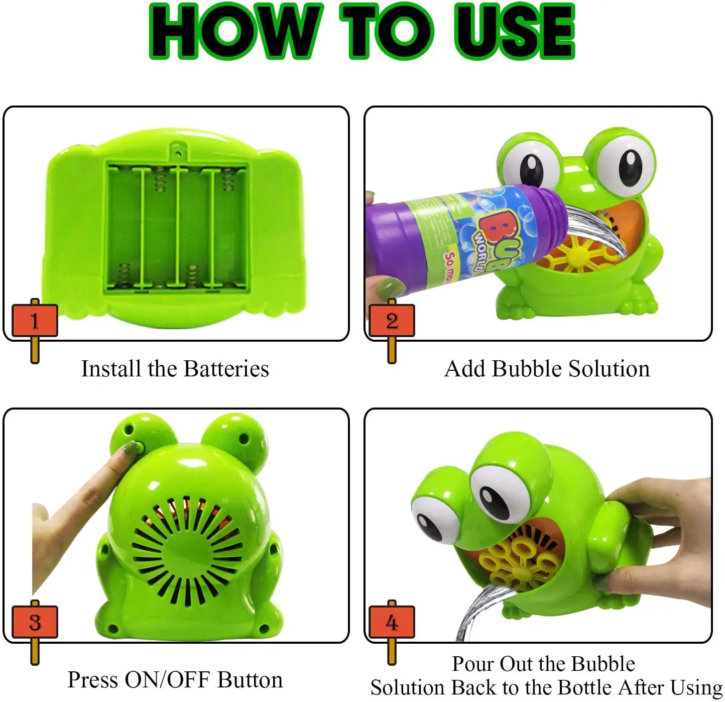 Blowing bubble maker Simply pour the bubble solution in, and press the power button- then watch the air fill with colorful bubble madness!